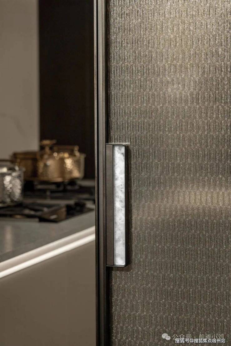 厨房内竹纹夹丝玻璃门、威乃达坡璃烤漆橱柜、与卡拉拉金大岩板台面相融,同时嘉格纳十件套满足每一种味蕾的偏好,厨房内,灶台/油烟机/洗机/冰箱(独立分体设计)五件套;向外,嘉格纳咖啡机/暖碟机/酒柜/烤箱/蒸箱等西厨五件套配置,构筑中西共融的烹饪场域。