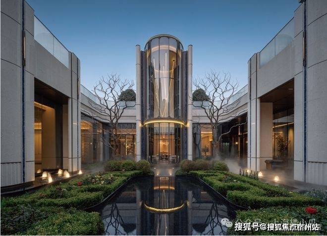 考究《周礼·考工记》古代规格定制“面阔九间”归家门庭,门庭外立面采用雅奢温润的建筑材料,辅以两侧具有仪式感的跳泉水景,共同构成了“贵雅清和”的城市界面。