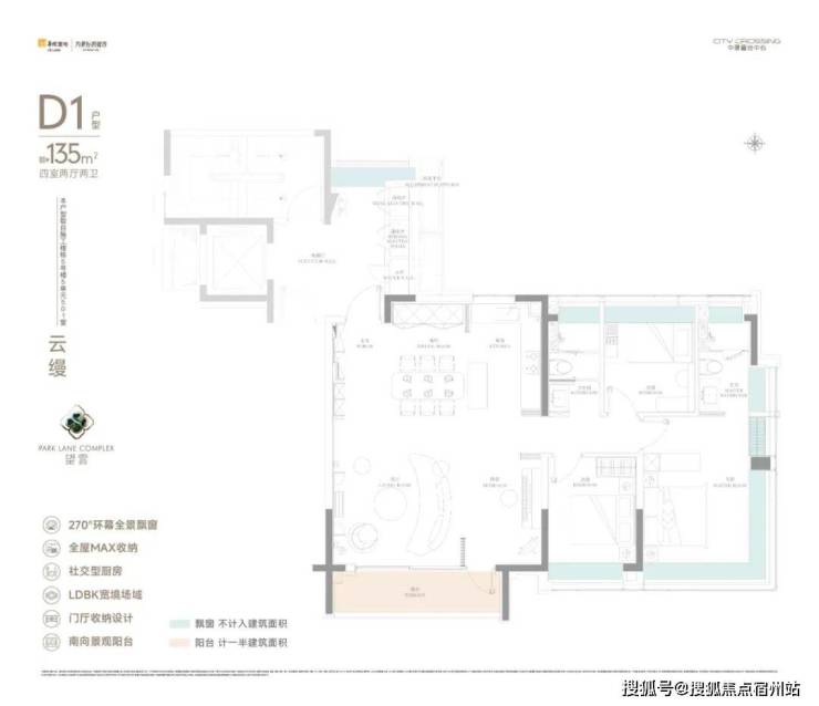 大尺度:四开间朝南+豪华主卧的 约270°无柱转角飘窗+横跨客厅和次卧的宽面阳台 ,整个户型的尺度感拉满。