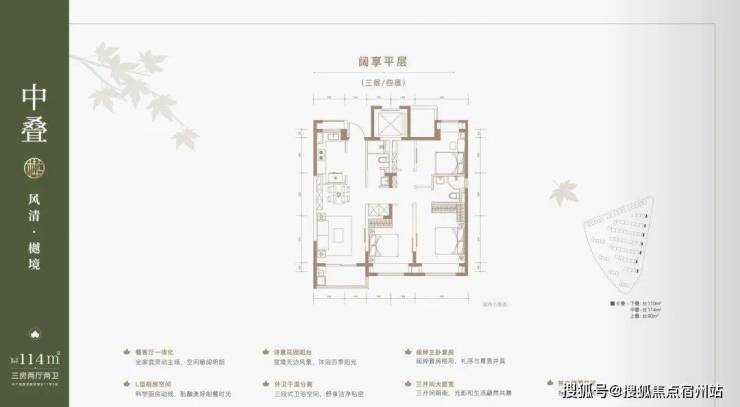 建面约102㎡3房2厅2卫户型,做到了三开间朝南+双朝南卧室带飘窗+动静分离+卫生间干湿分离,采光面拉到极致!是一个非常方正的户型。