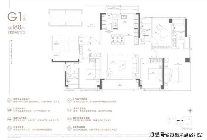 188户型2梯2户,有独立的电梯厅。4房3卫设计,✅✅中環置地中心望雲售楼处电话:400 - 882 - 4258✅✅还是3明卫,这两点还是不错的。