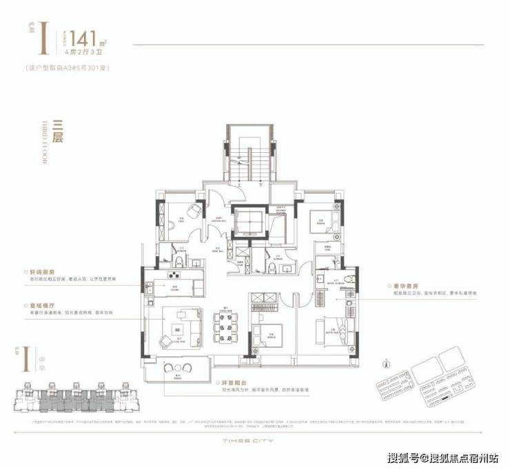 中平户型以四开间朝南的IMAX级采光面,打造出堪比市区豪宅的尺度感。4房4飘窗2阳台的设计,配合双套房布局,一共有三个套房,让每个家庭成员都享有独立私密空间。