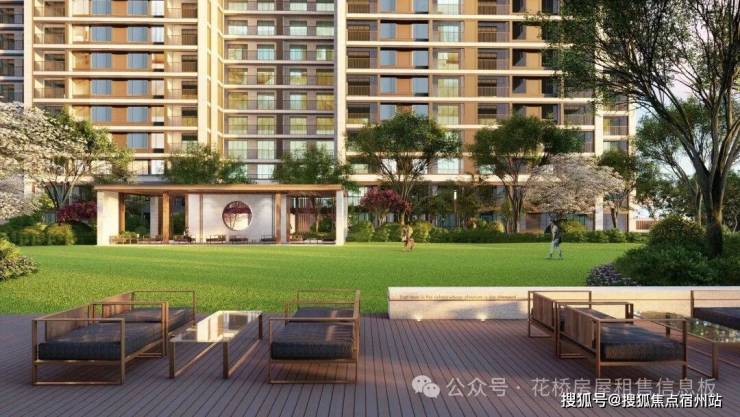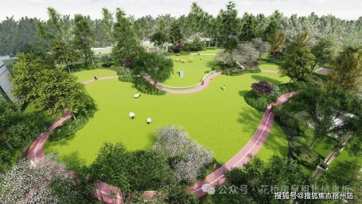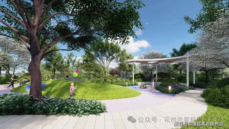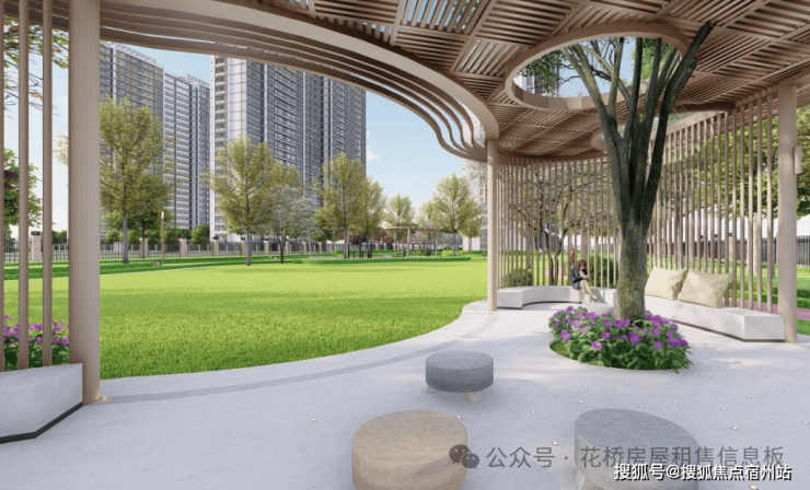 (项目景观效果图)【项目景观】以自然会客厅为核心主景,融入艺术廊架、阳光大草坪、泛会所架空层、健康跑道、儿童乐园等功能场地,构建风景中的社交场情景阳光草坪: