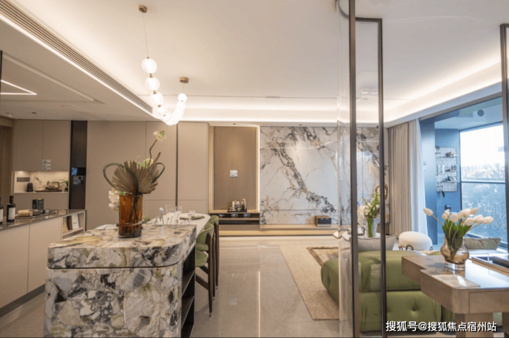 整体大面宽客厅,以岩板背景墙作为点缀装饰,弧形吊顶,造型别致,空间品质大幅提升:
