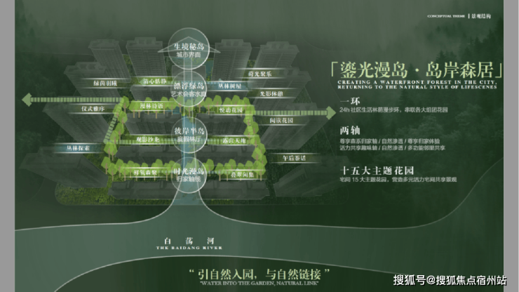 整个社区内,项目规划“一环两轴十五园”景观布局,将水岸、岛屿、森林、花园、树屋作为园林节点,营造出沉浸式山水活力场域。