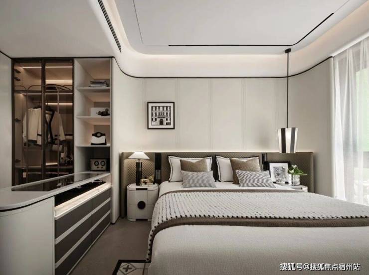 卧房设计尤为出色,空间分区清晰。床头背景墙与护墙采用皮质材质,以经典黑白调铺陈,质感卓然。床边岛台设计兼具美观与实用:内侧集成梳妆功能,外侧及下方则规划为贴身衣物收纳区,使用便捷。