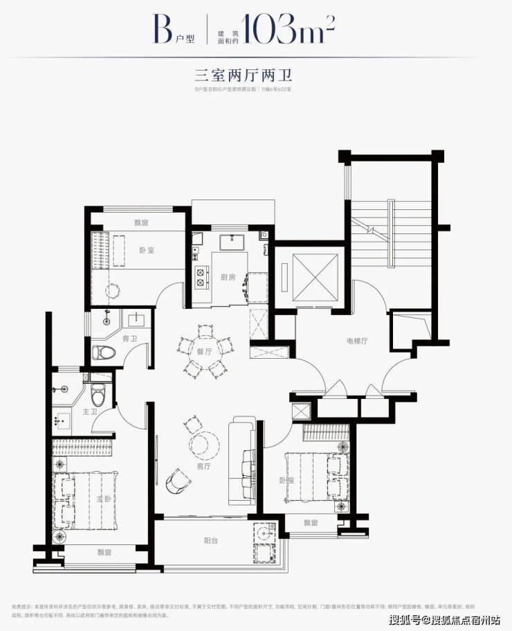 此户型在103㎡户型的基础上,将南向主卧、北向次卧均升级了约270°转角飘窗设计,采光视野及美观性都得到了极大提升。