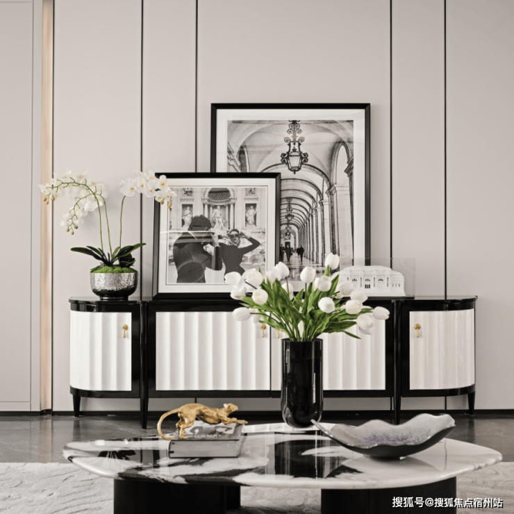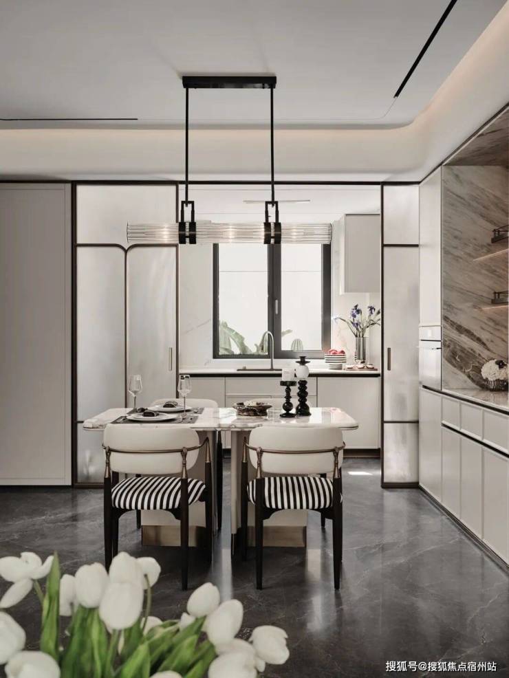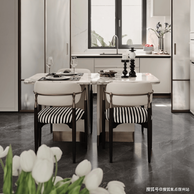 从餐边柜、推拉门、餐椅扶手、餐桌支撑底部到墙面装饰,以黑白为主调,辅以金色元素点缀,以材质和色调搭配碰撞勾勒出香奈儿式的精致感和奢华氛围。