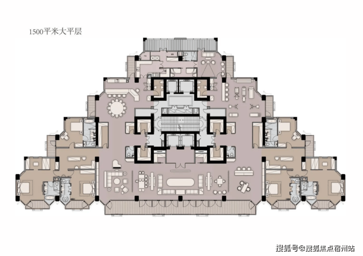 最豪气的还是这个整层一户 建面约1500㎡的大平层户型。它南向面宽达60米,有14个阳台!