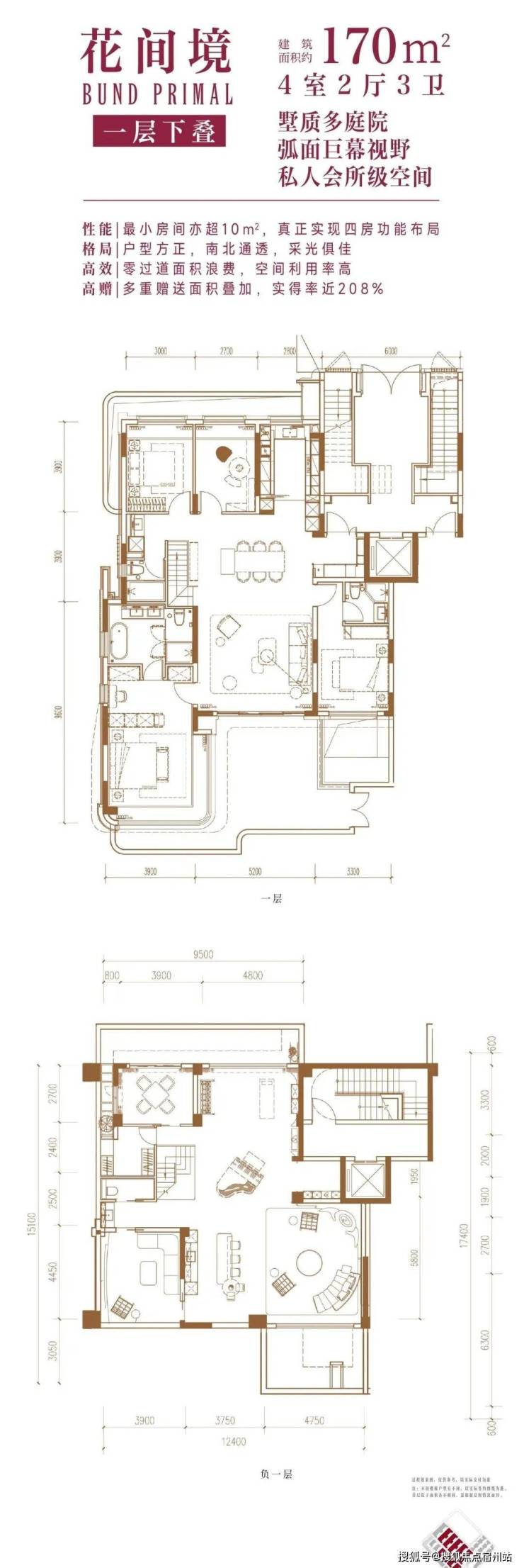 一楼户型附赠花园和超大地下室,地下室还配置两个采光内庭院;二楼户型附赠转角星空露台;三楼附赠露台及其他空间。计算附赠空间后,主力户型三层的实得率能达到约114-210%。