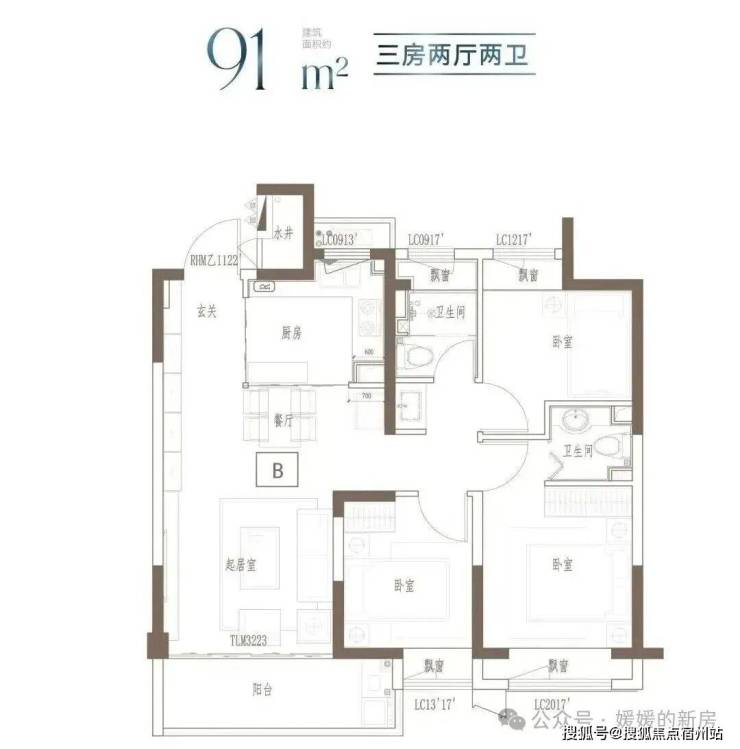 建面约91㎡-121㎡ 3房2厅2卫;这几个户型都是3房的设计,满足想一步到位的购房者。3开间朝南+客餐厅连通阳台+全卧室飘窗,以及套房式主卧设计+2卫,即使是三代同堂,也能让生活从容。