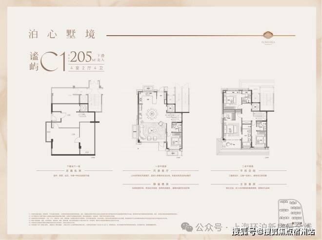 户型特点:下叠边套,南向面宽约9米,客餐厅同宽约5.8米,空间开阔。一楼设南向卧室,采光好且视野佳。二楼为三套房+主卧总统套房设计,主卫南向,可容纳浴缸和双台盆。地下室方正,附赠采光井,利用率高。