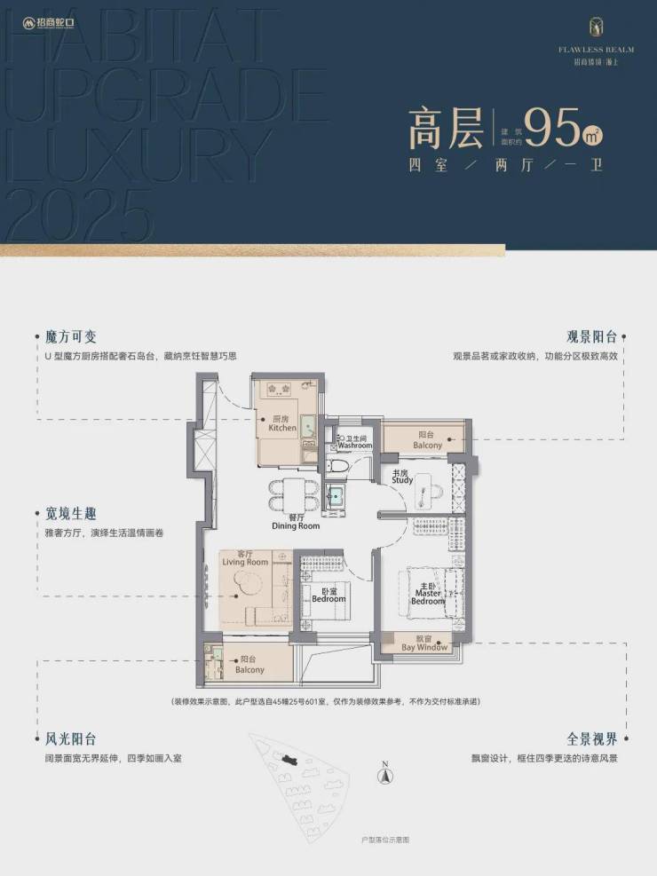 建面约95㎡高层,全系方正户型,双阳台设计,LDKB一体化设计,贯通动区轴线,打造温馨的家庭生活聚餐;☑️☑️招商臻境售楼处电话:400-1183-605☑️☑️