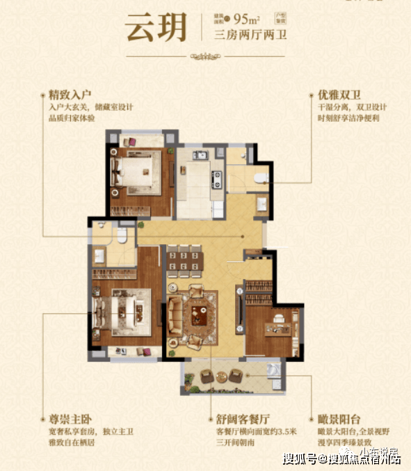 约95㎡三房两厅两卫,做到了 三开间朝南+瞰景大阳台+主卧套房设计+南北通透+卫生间干湿分离,该户型得房率和空间利用率都非常高。