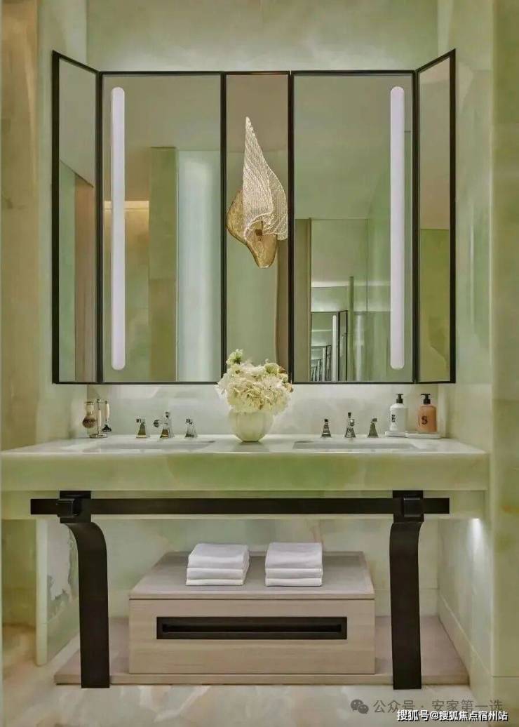 顶层下午茶区以淡绿为底,壁炉暖光漫过手绘地毯的肌理,将社交场域沉淀为冥想容器;主人房墙面缟玛瑙(Onyx)的天然流痕,也与一层屏风暗纹形成时空对位,光影在矿物晶体中生长出私密的诗。