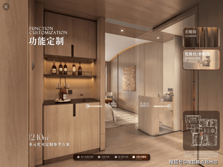 甚至还有功能定制,以240㎡主卧衣帽间为例,提供 整体收纳、化妆台、水吧台 等多种布局,精准贴合个人生活习惯。