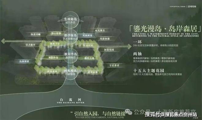 2、一环两轴十五园,构建都会山水聚场: 以“山水聚场”理念,规划“一环两轴十五园”景观布局,将水岸、岛屿、森林、花园、树屋作为园林节点,形成“行在景中、坐在岛中、游在林中、意在境中”的美学表达,营造出沉浸式山水活力场域。