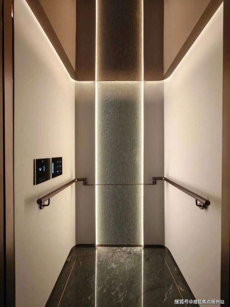 再来看看项目的样板间,还没有进入到样板间内就能感受到扑面而来的尊崇感了,这个是项目约200㎡下叠户型的电梯,市面上大多小区的公区电梯可能都没有它做的好,而且它还是一梯一户的设计,极具私密性!