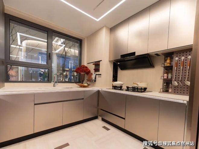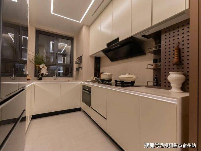 项目对厨房的考量贯穿每一处细节:采用高效的U型布局,洗、切、炒动线一气呵成。
