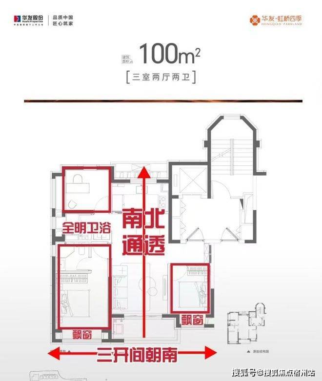 建面约100㎡户型是“明星”户型,无过道面积的浪费,空间尺度感阔绰。