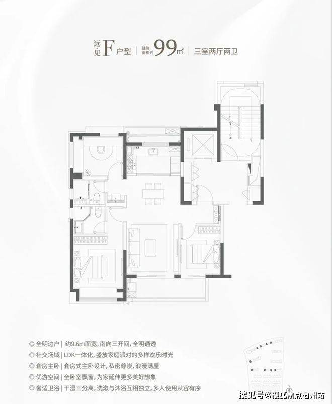 F户型:远·见 建筑面积约101㎡,三房两厅两卫