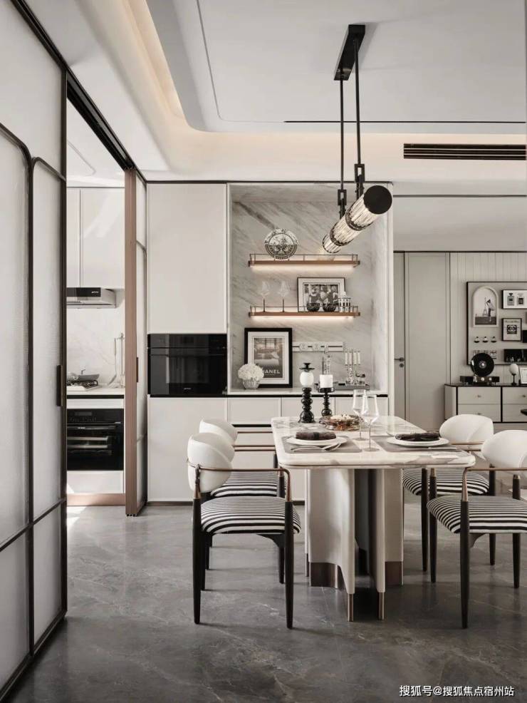 从餐边柜、推拉门、餐椅扶手、餐桌支撑底部到墙面装饰,以黑白为主调,辅以金色元素点缀,以材质和色调搭配碰撞勾勒出香奈儿式的精致感和奢华氛围。
