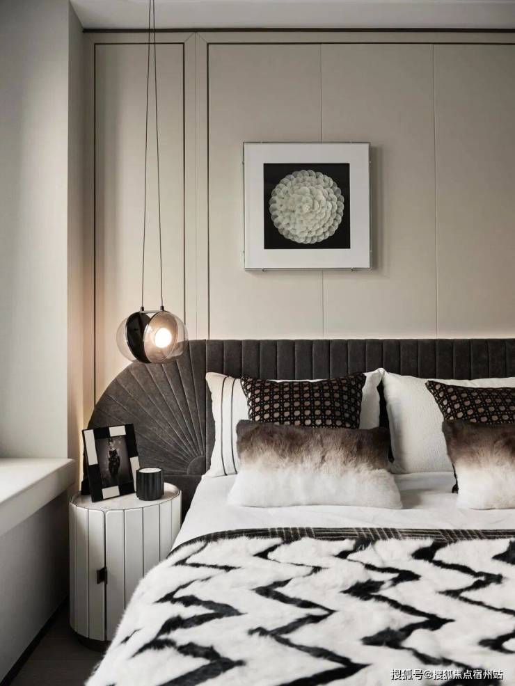 卧房设计尤为出色,空间分区清晰。床头背景墙与护墙采用皮质材质,以经典黑白调铺陈,质感卓然。床边岛台设计兼具美观与实用:内侧集成梳妆功能,外侧及下方则规划为贴身衣物收纳区,使用便捷。