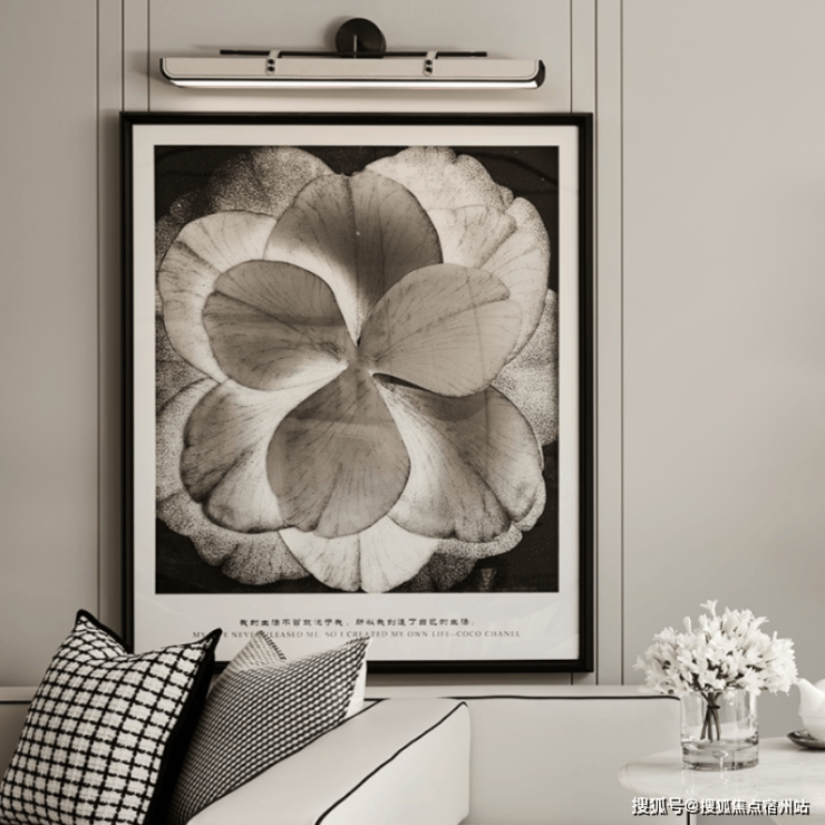 地砖拼花融入香奈儿标志性黑白格元素;餐边柜、阳台柜等定制家具延续黑白主调,搭配复古元素;餐椅搭配精致不锈钢,以材质碰撞勾勒出香奈儿式的精致感;山茶花装饰画在空间悄然绽放,巧妙融入到家具、布艺及装饰品中,进一步强化了空间的主题。