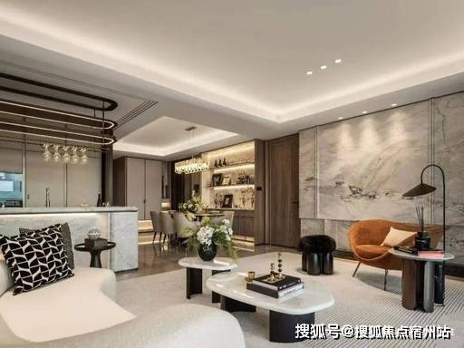 石材:全屋铺设芬迪白、奈儿灰等珍稀奢石,背景墙采用天然大理石,纹理独一无二,质感厚重高级。