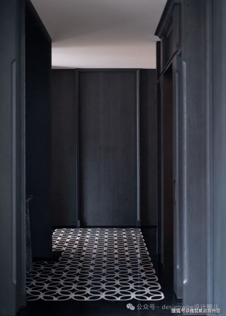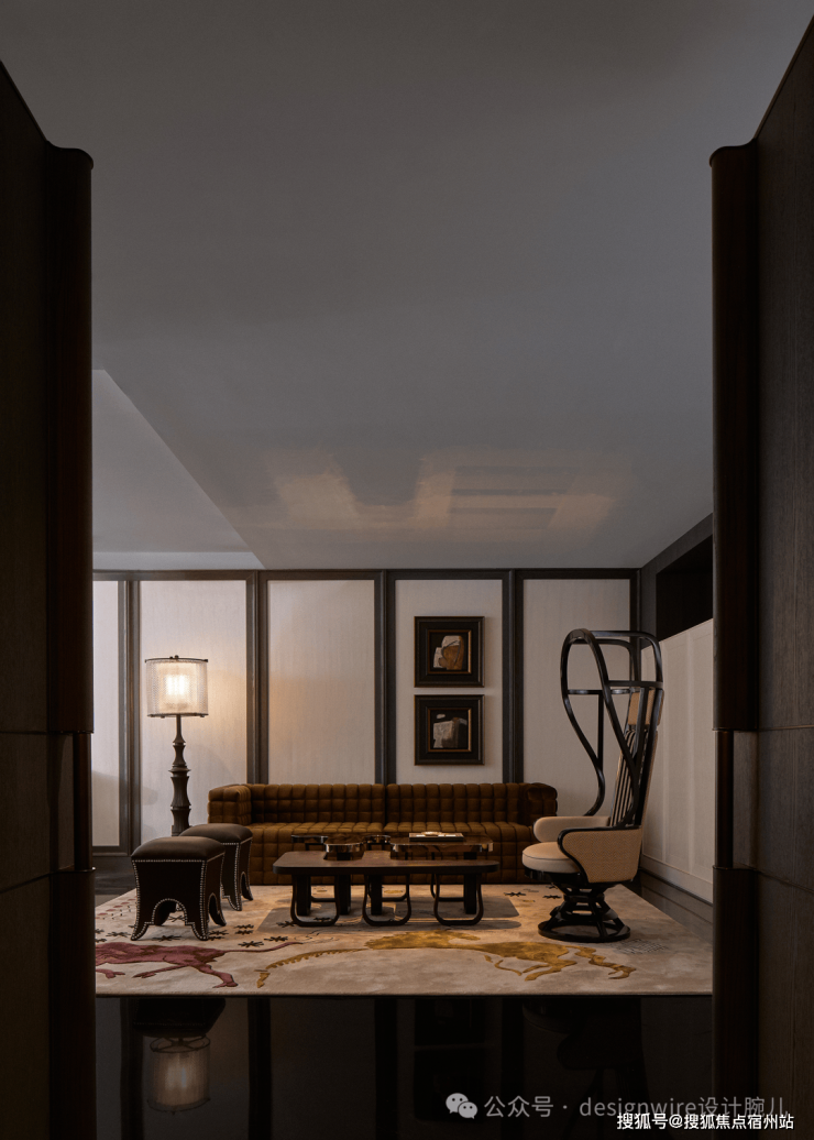 上行至二层,抵达静谧休憩区,专门的过道厅如同一方枢纽,是家居生活外放与内收的过渡地带。地面用黑金的石材营造宁静如水的视效,中古风高背座椅与立体格纹沙发,成就多元的生活场景。