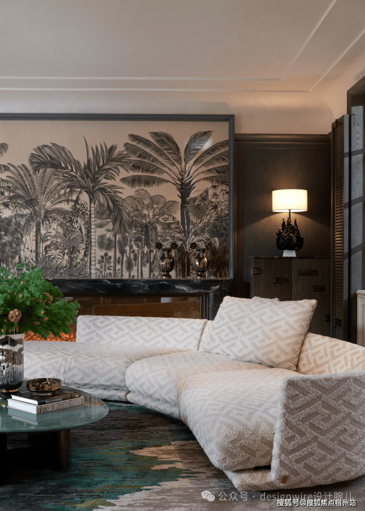 推开家门,转入会客厅空间,深色主调之下饰以明亮跃动的线条,弧形沙发之上的背景画灵感来自法国香奈儿公馆的漆画,平添轻松度假氛围。