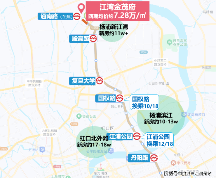 未来,从18号线通南路站(在建,预计年底通车) 出发,咫尺新江湾,3站财大,4站复旦,5站五角场,7站新华医院,10站杨浦滨江、虹口北外滩,11站陆家嘴滨江……