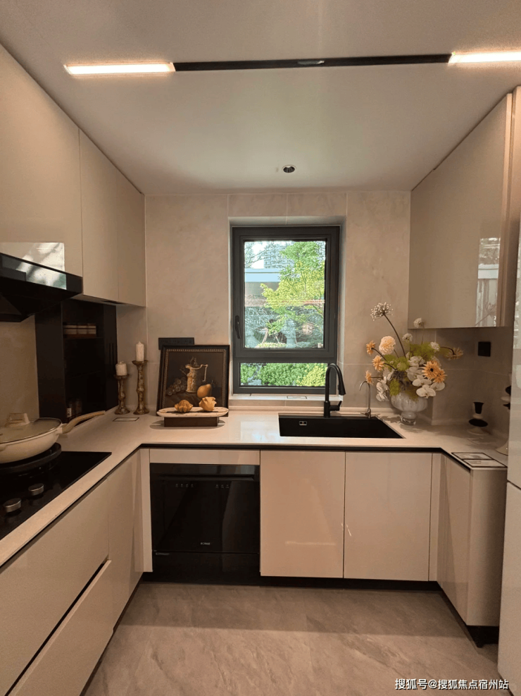 厨房:配备方太 / 老板油烟机、燃气灶,科勒 / 摩恩水槽、水龙头,石英石台面,防水防潮,实用美观;