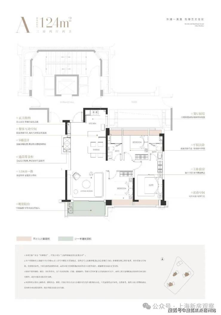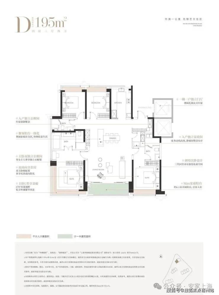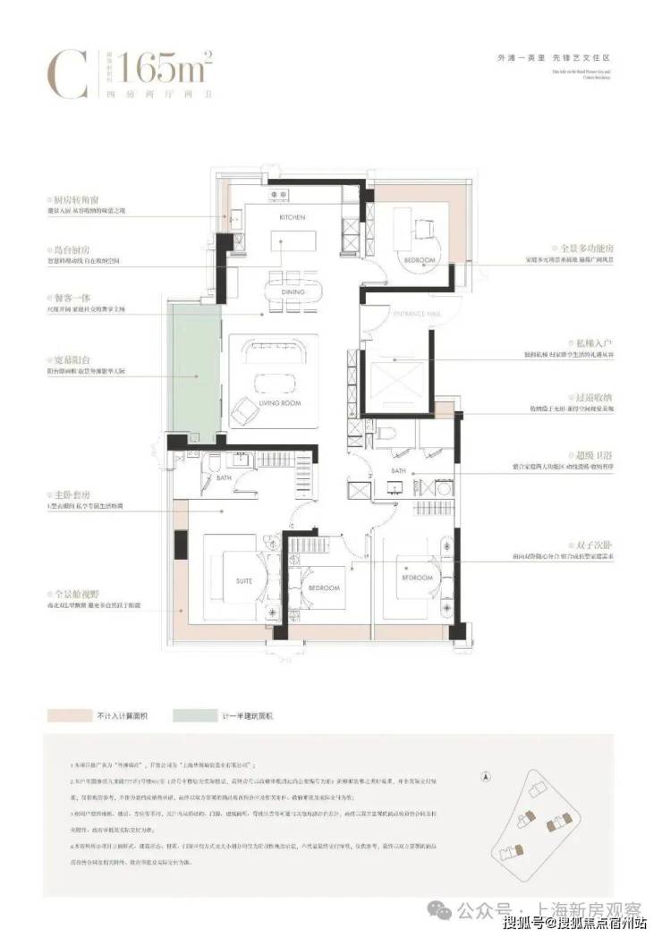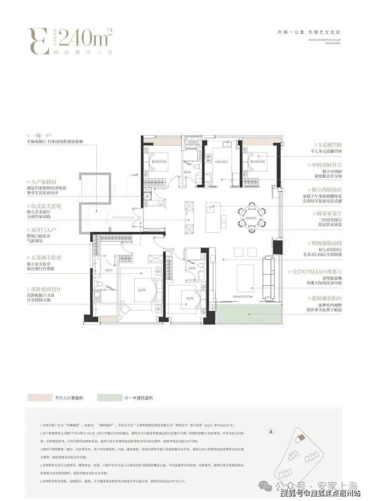 大横厅 尺度感奢阔, 尊享私梯入户 ,隐私性满分! 三间卧室朝南设计的平权户型 ,老人、小孩均可享受南向采光; 厨房转角窗、主卧套房、北向书房均配置270度转角飘窗 ,景观视野相当不错! 次卫四分离设计 ,相当人性化~