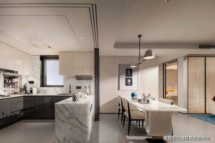 开放式厨房+岛台设计空间更通透 ! 转角抽屉收纳、下拉栏顶部设计反光镜避免视觉死角、轨道插座置于岛台侧墙 不占台面空间等等,众多收纳细节思量到位,匠心独运!