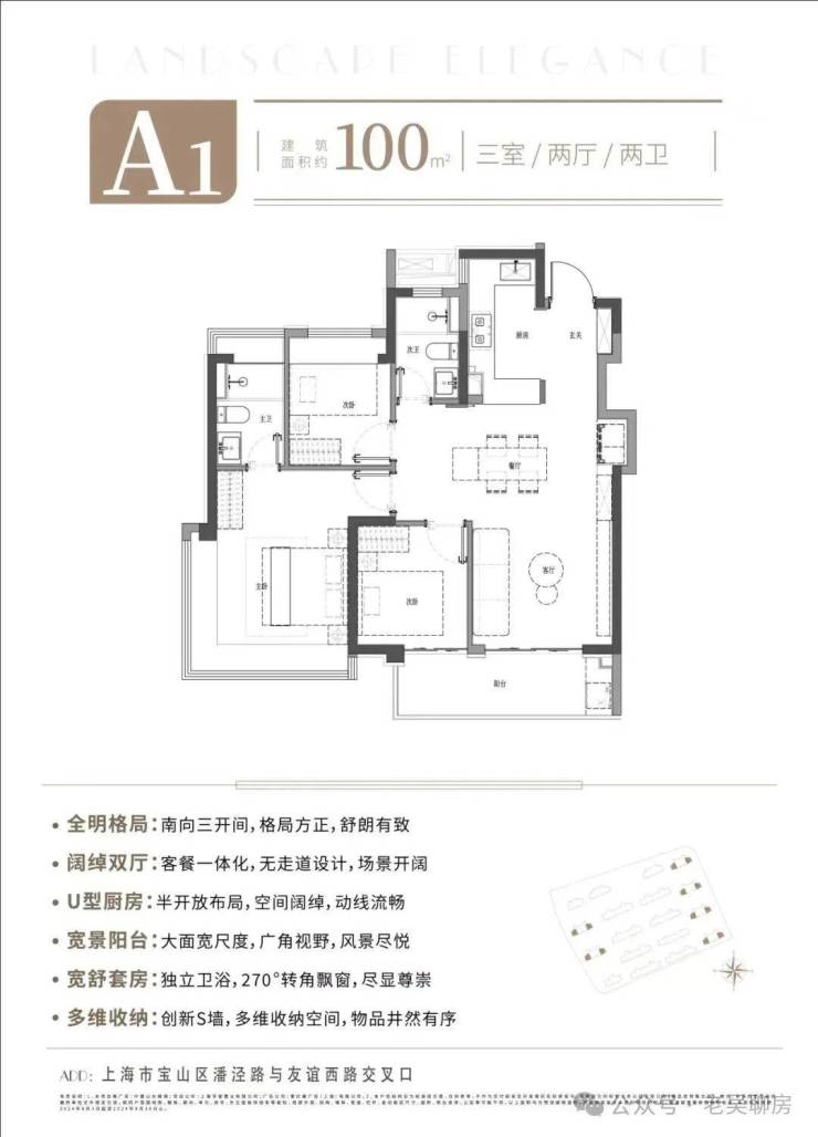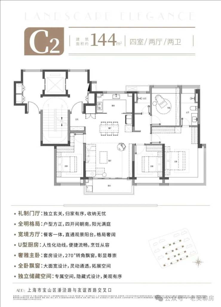 大尺度聚合方厅,为全家人打造陪伴高能的欢聚场; U型厨房,与一体化客餐厅、宽景阳台贯通,令家居动线更开阔流畅; 奢雅主卧套房,270°转角飘窗视野,主人品位与格调尽情绽放;隐藏式独立储藏空间,可更轻松、有序收大件物品。