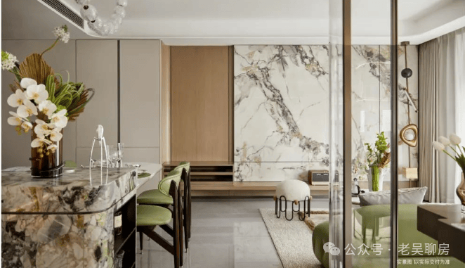 客厅岩板背景墙的应用,典雅气派、肌理丰富,营而着简约不失奢华的家居氛围。