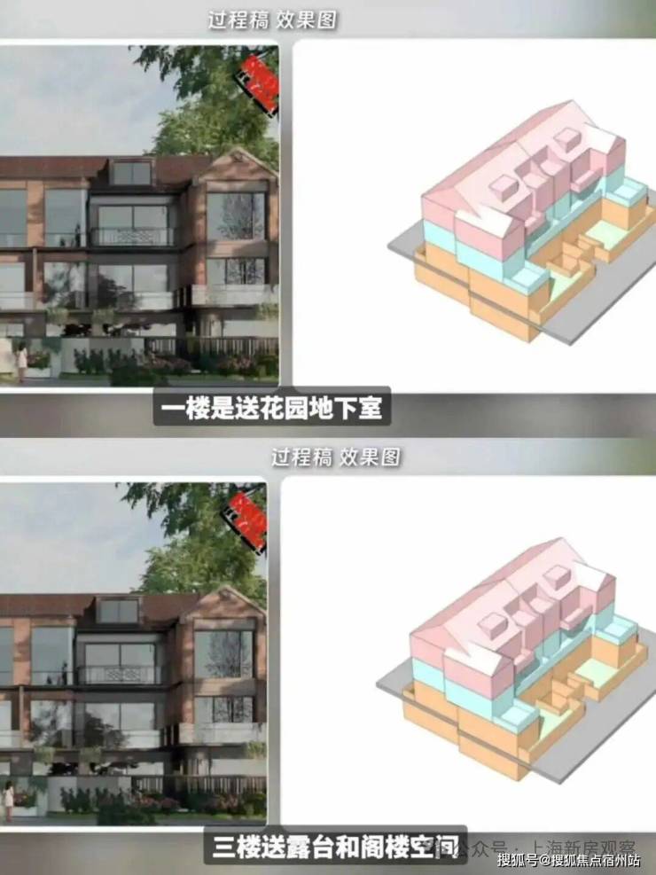 一楼户型附赠花园和超大地下室 ,地下室还配置两个采光内庭院; 二楼户型附赠转角星空露台 ; 三楼附赠露台及其他空间 。计算附赠空间后,主力户型三层的实得率能达到约114-210%。