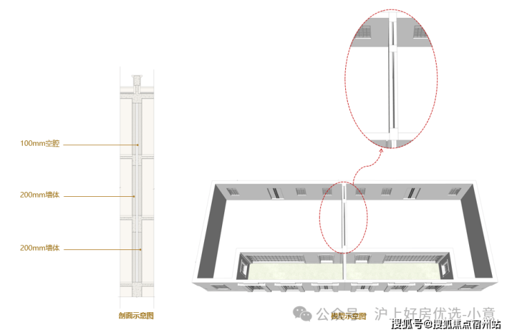 与其他风貌共用一堵分户墙不同的是,忻园的风貌别墅采用 双层分户墙做法,每户之间没有共用墙。200mm厚度的墙体,中间还设置了100mm空腔,避免邻里的相互影响,带来舒适静谧的居住感受。