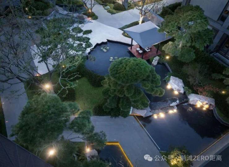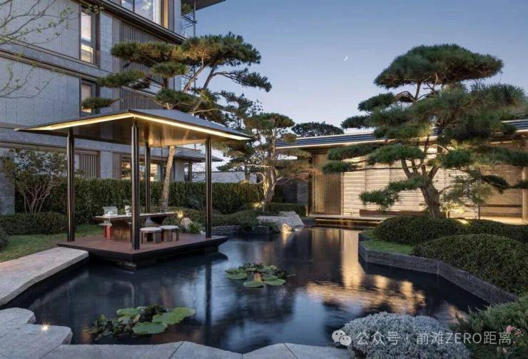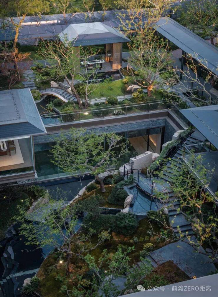 庭院的选材也极具讲究:太行山金景石堆叠成小山丘,岭南古桩铁冬青与中华原生乌桕树移栽而来,蕴含“聚财守业”的美好寓意。细节之处,经得起推敲,让人越看越有味道。