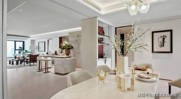 中间的西厨岛台是点睛之笔,既起到联 ✅✅ 海玥黄浦源售楼处电话:400-9975-759✅✅动南北的作用,比如你在此料理可同时与客厅、餐厅的家人互相交谈,同时这中间一间隔,又让客厅、餐厅相互独立。