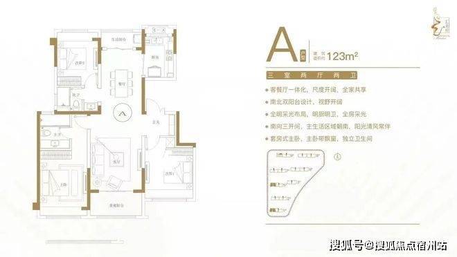 建面约123㎡三室两厅两卫户型特点:客餐厅一体化,尺度开阔,全家共享;南北双阳台设计,视野开阔;全明采光布局,明厨明卫,全房采光;南向三开间,主生活区域朝南,阳光清风常伴;套房式主卧,主卧带飘窗,独立卫生间。