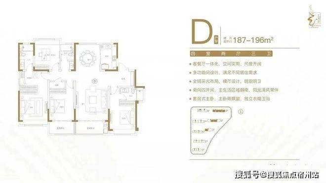 建面约187-196㎡四室两厅三卫户型特点:户型方正,南北通透,动静分区有序;双套房设计,卧室带飘窗,独立卫生间;客餐厅一体化,尺度开阔,全家共享;全明采光布局,告别暗房,明厨明卫;南向四开间,阳光清风常伴。