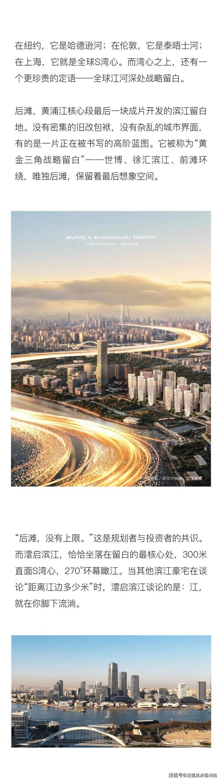 黄浦江奔涌千年,见证上海从江南渔村到国际大都市的蜕变;滨江人居迭代百年,始终是城市高净值人群的终极向往。澐启滨江,以江河为诗,以匠心为笔,于上海后滩黄金 S 湾,筑就一座集地段、景观、产品、配套、圈层于一体的滨江恒产。