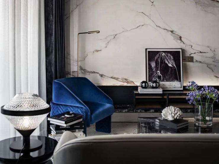 同时, 社区内部景观打造了大面积的叠级水景,搭配普拉达绿大理石和浪淘沙石材,呈现整体空间的隐奢基调。