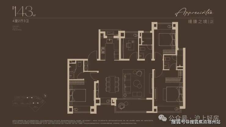 建面约143㎡四房设计,不论是三代同堂还是二娃家庭,都舒居无忧!2梯2户的设计, 极具私密性的入户门厅,彰显大宅归家礼序 。独立玄关,既是归家仪式感,更添收纳空间;约14米朝南面宽,搭配约7米尺度横厅,尽显大宅风范; 东西双套房设计,奢享全龄世家的静谧时光。
