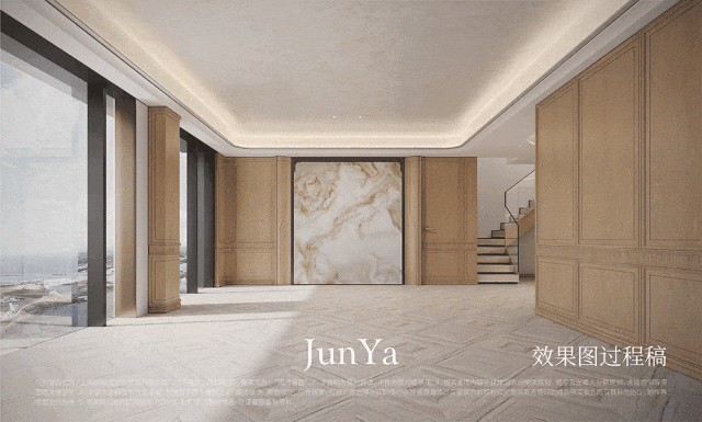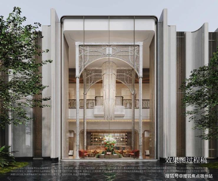 入口吊顶采用恢弘大气的穹顶形制,嵌入和平饭店同款花格窗搭配透光云石,搭配酒店式落客庭院, 让业主下车瞬间,就能感受庄园式的礼遇与从容。