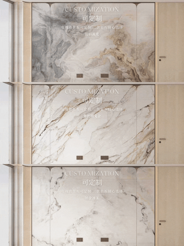 洋房定制同样采用「三重定制主义」 ,不仅从天奕时期的单一背景墙定制, 升级为电视背景墙与厨房背景墙的一体化岩板定制 ,提供三大高端色系选择。
