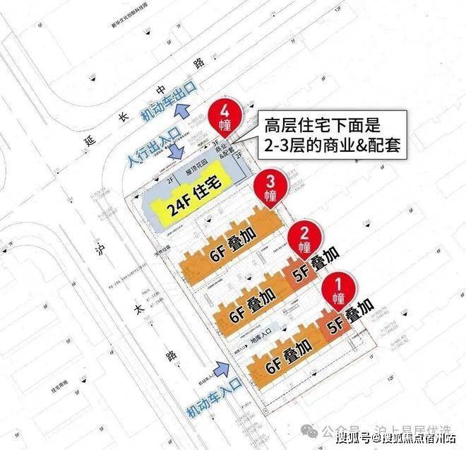 项目采用高低配设计, 总计175套房源,项目由一栋24层高层和3栋5-6层叠墅组成,高层105套(108至123㎡ 3房4房)、叠墅70套(180到220),自4层起架于3层商业之上。