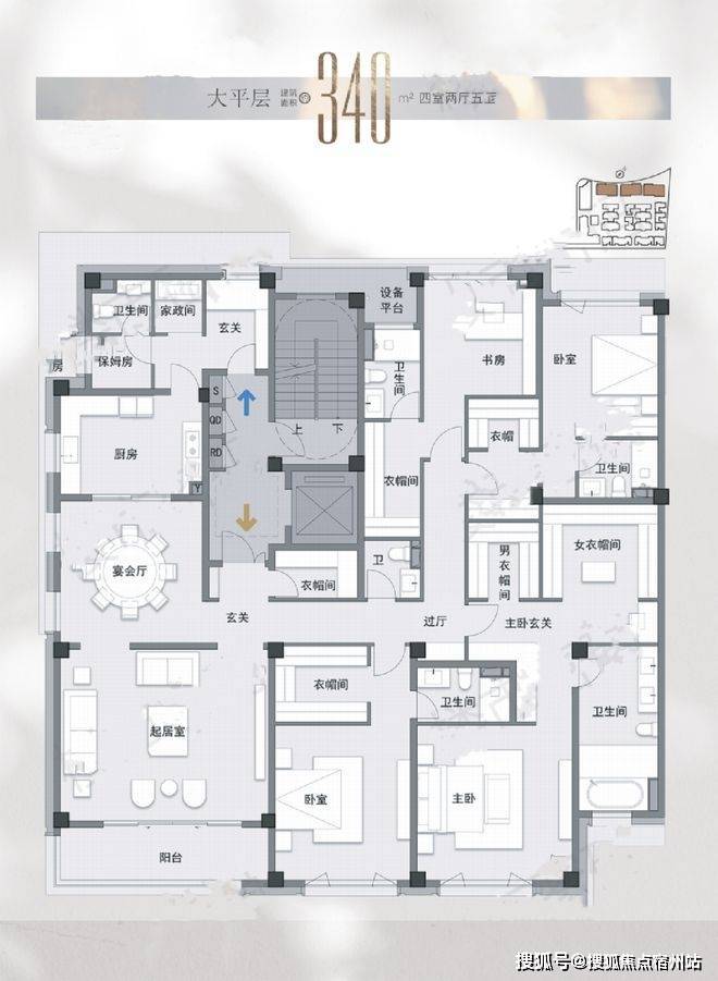 340㎡这个户型设置了保姆房和家政空间,还分别设置了两个入户门,仪式感拉满。三间卧室,全部为套房设计,书房都有独立卫生间和储物空间。而这个户型房源会略多一些,预计总价应该在5000万+。